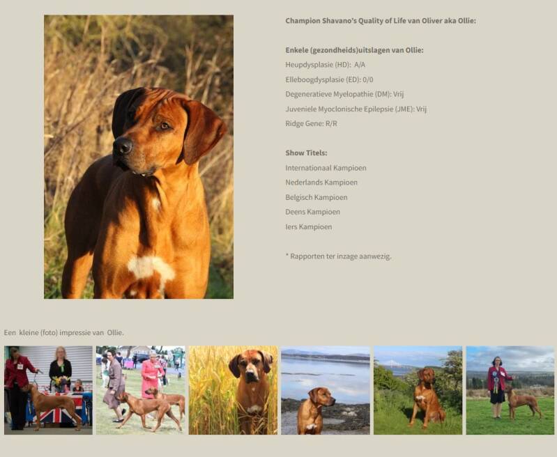 Het was een hele zoektocht maar we hebben voor Fiona mister 'right' gevonden in Schotland. Op shows heeft Ollie met zijn baasje Claudia zijn 'strepen' verdiend. Hij is Deens, Belgisch, Nederlands en Iers Kampioen. Ollie staat naast zijn goede looks ook bekend om zijn 'easy going' gedrag in en buiten de show ring. Ollie woont met zijn familie in Schotland en geniet om met zijn baasje en roedel dingen te ondernemen. Wij denken dat Fiona en Ollie elkaar op alle vlakken aanvullen en verwachten blije, gezonde pups.